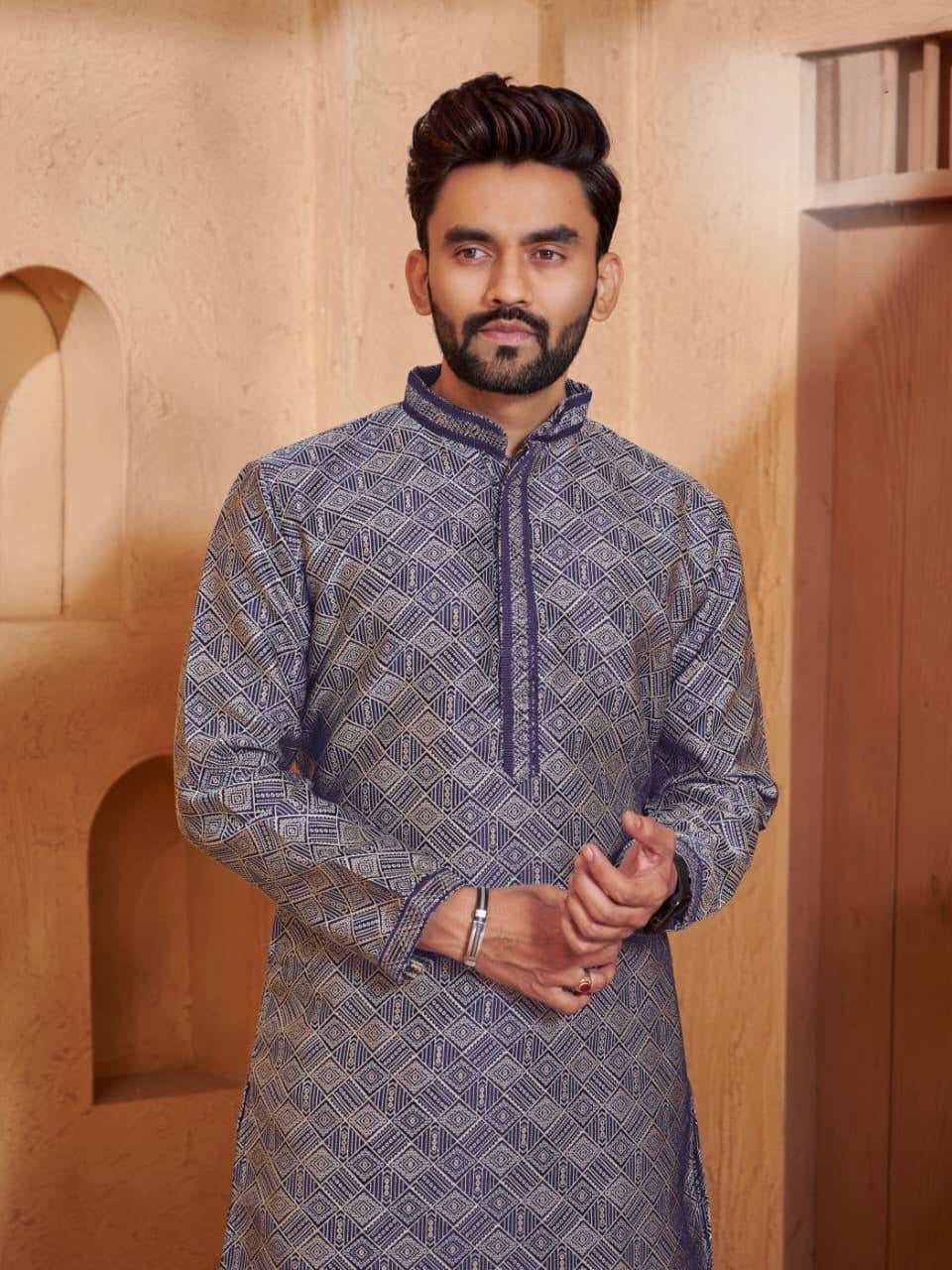 Step into the festive season with this jacquard kurta set, designed for modern men who value both style and tradition. Featuring a refined collar and tie design, the kurta pairs effortlessly with an elegant cotton silk pajama for a complete festive look.