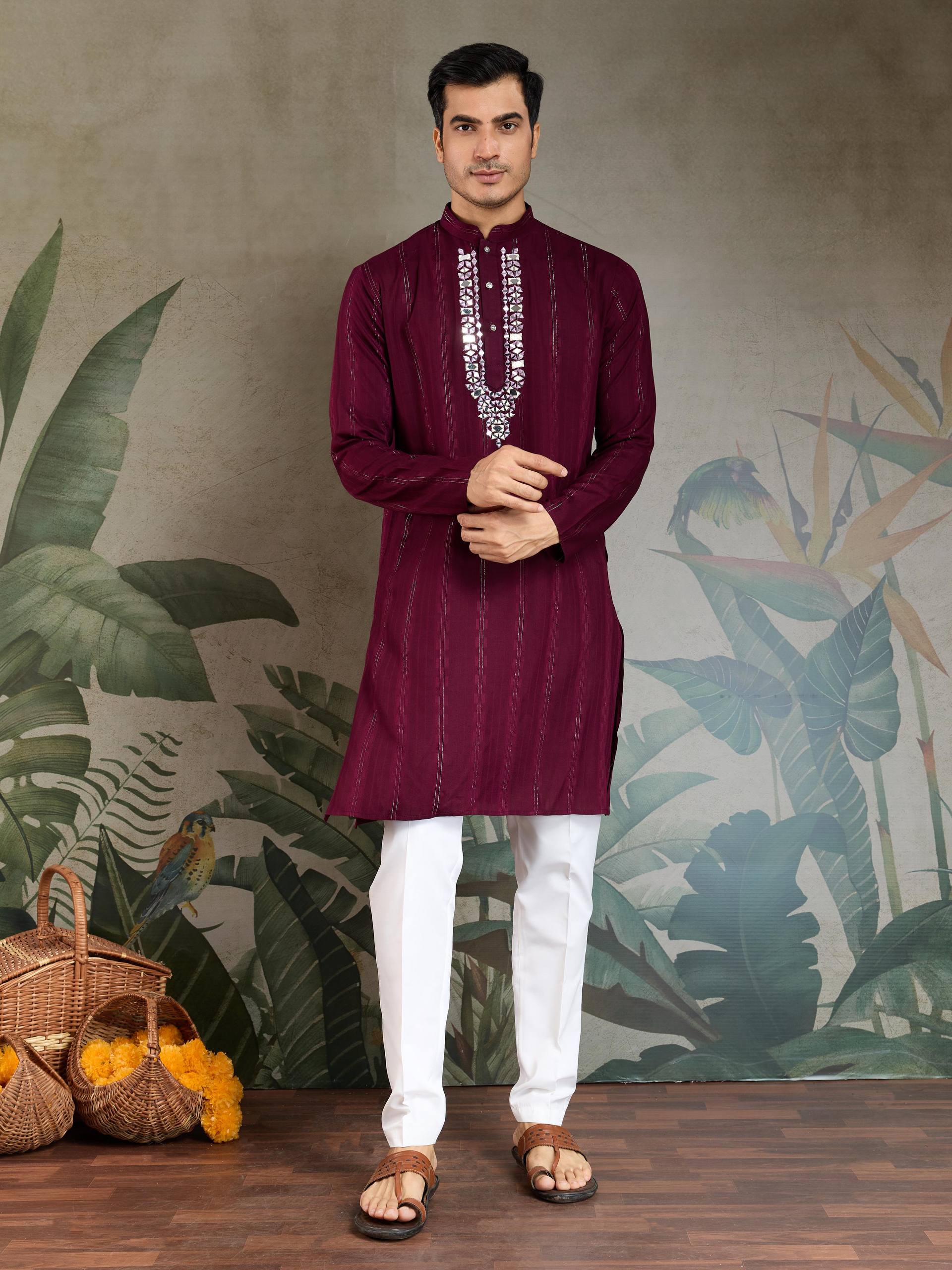 Add elegance to your festive look with this soft silk kurta, beautifully paired with a matching dupatta featuring ethnic patterns. Perfect for weddings, festivals, or any cultural celebration, this kurta is detailed with vertical embroidery and comes in rich festive colors.
