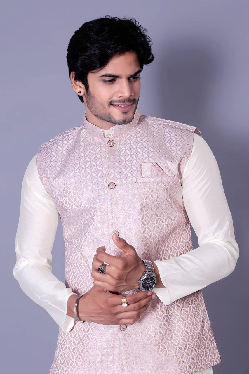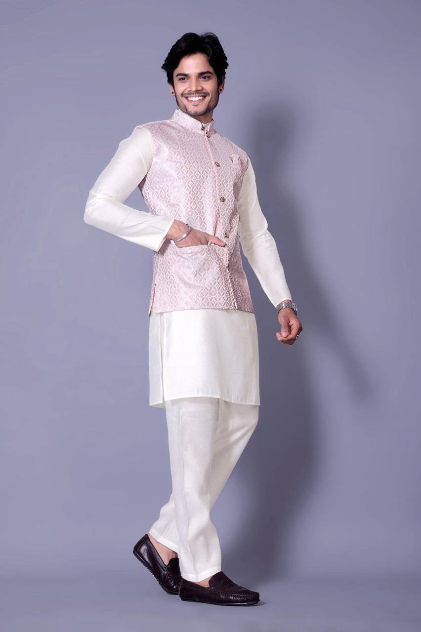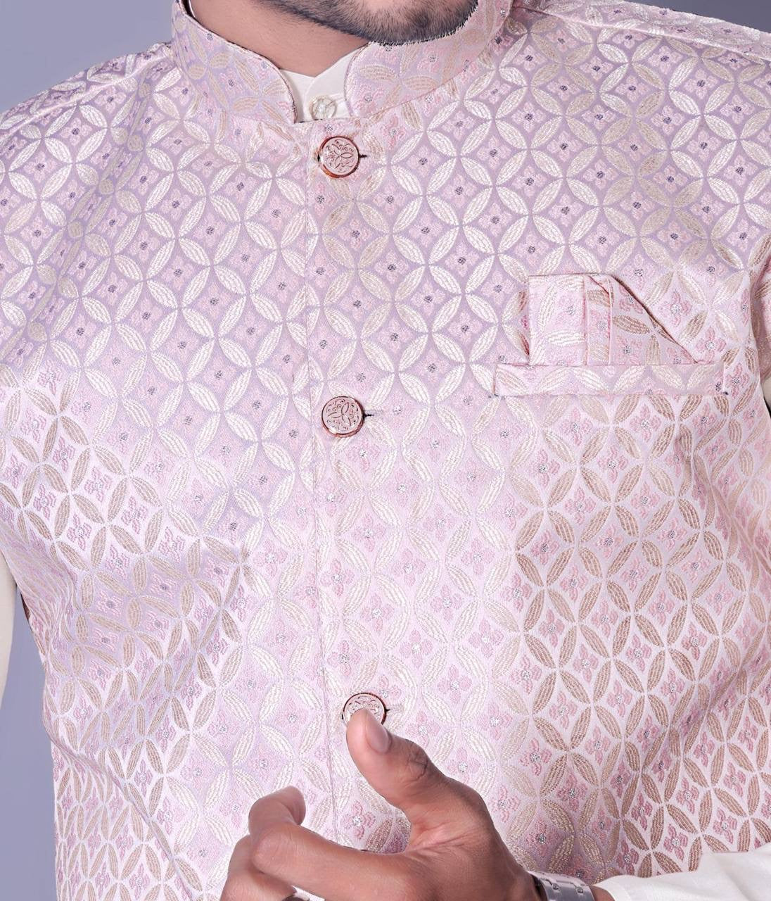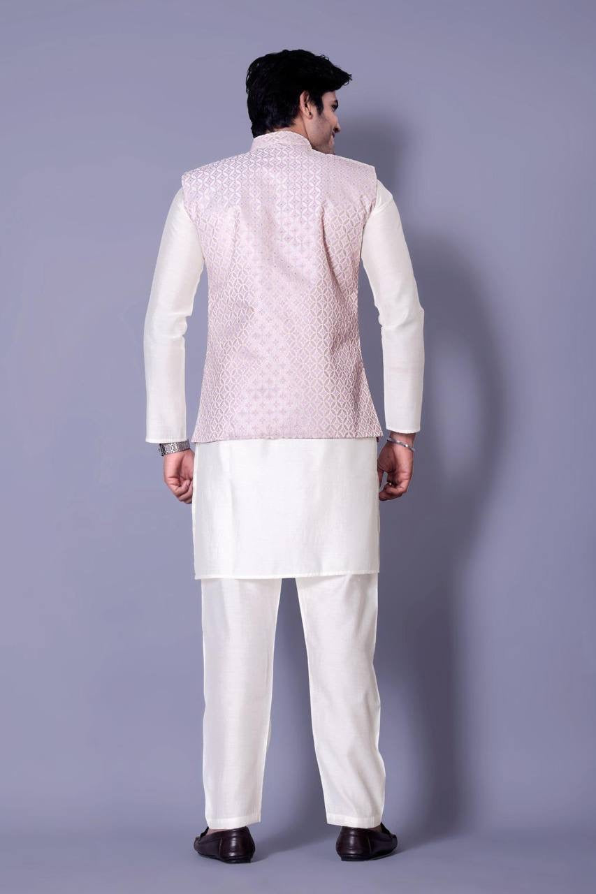 Cream Kurta Set with Pastel Pink Nehru Jacket