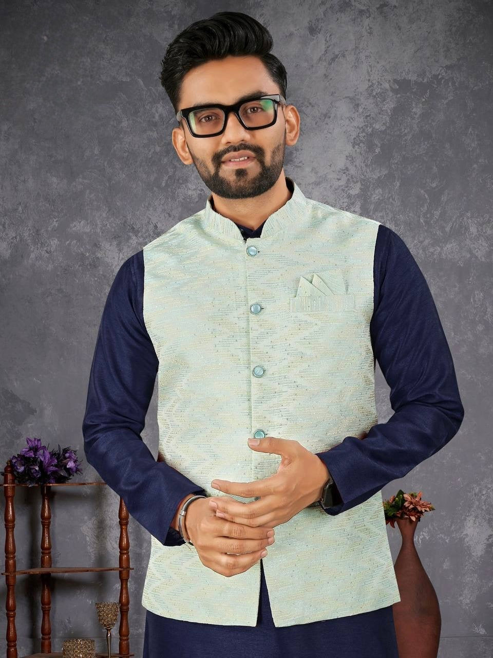 Subtle yet festive, this navy kurta and light aqua textured nehru jacket is ideal for day events or traditional gatherings..