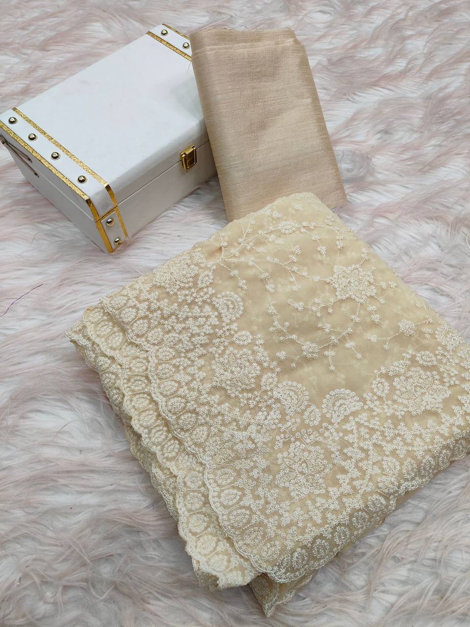 Blouse Fabric: Plain Banglori silk, perfect for pairing with the saree’s detailed design.