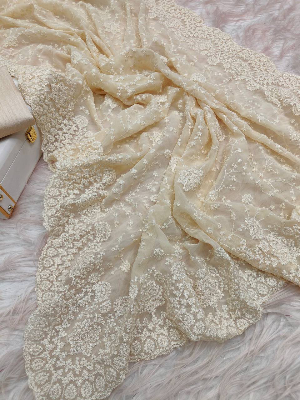 Saree Fabric: Soft georgette with intricate white thread embroidery and a cutwork lace border for a refined touch.