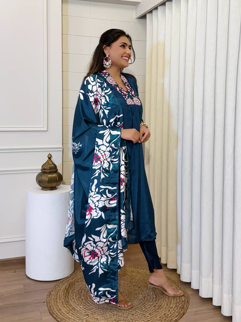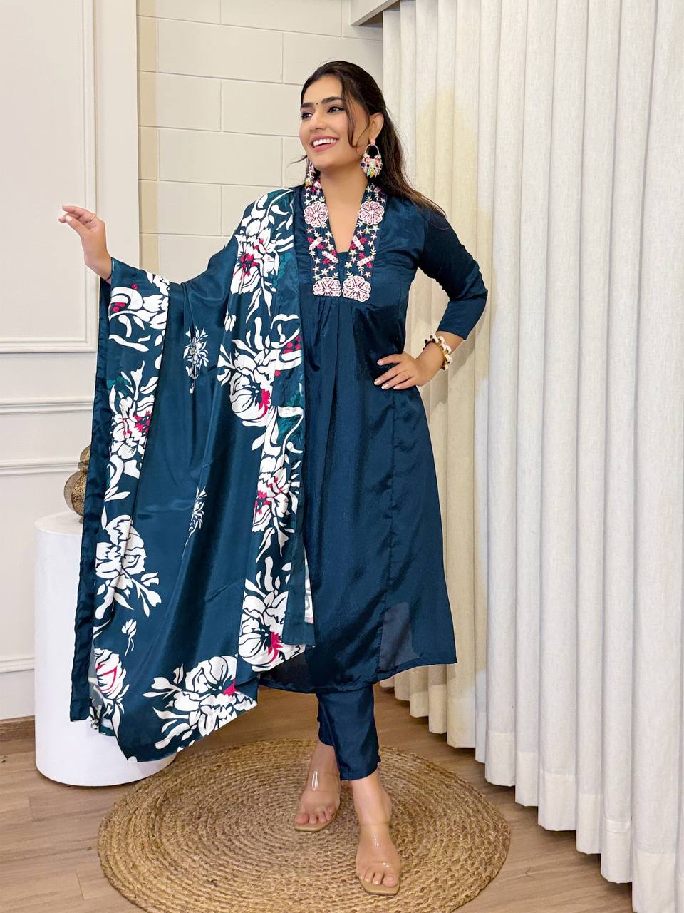 Step into timeless elegance with this rich teal Chinnon suit set, designed for festive flair and everyday grace. Featuring a beautifully embroidered V-neck collar, a flattering full-flare kurti, and a statement printed dupatta - this set is perfect for any celebration or stylish day out.