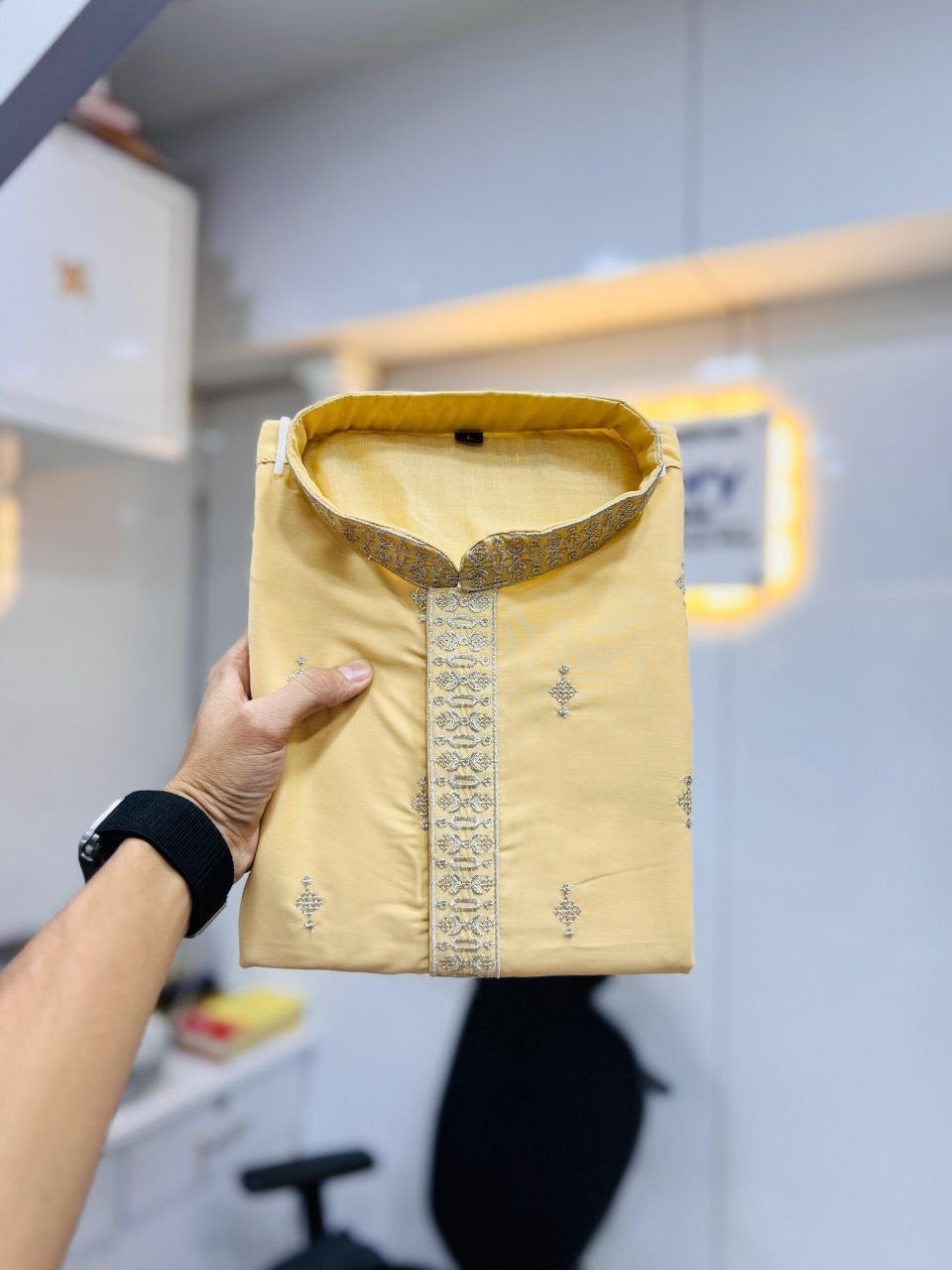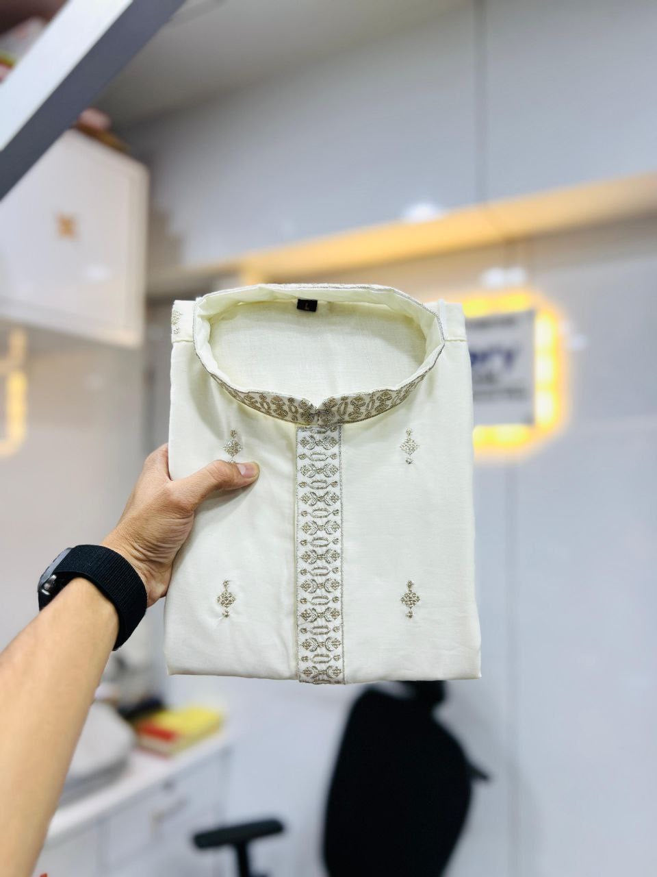Elegance made easy – featuring all-over silver jari buti embroidery on rich Matka silk. Paired with a comfy cotton pajama. Perfect for weddings & festive occasions.