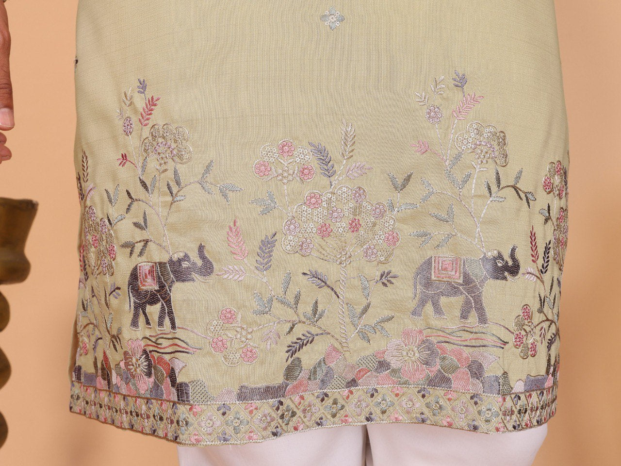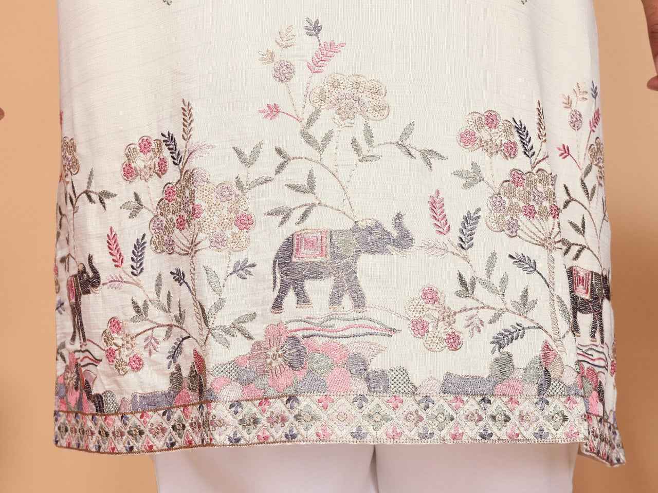 Men’s Kurta Pyjama Set crafted in linen cotton with elegant embroidery and sequence work. Designed for comfort and style, paired with a semi-cotton pants for a complete traditional look. Perfect for festive and traditional occasions.
